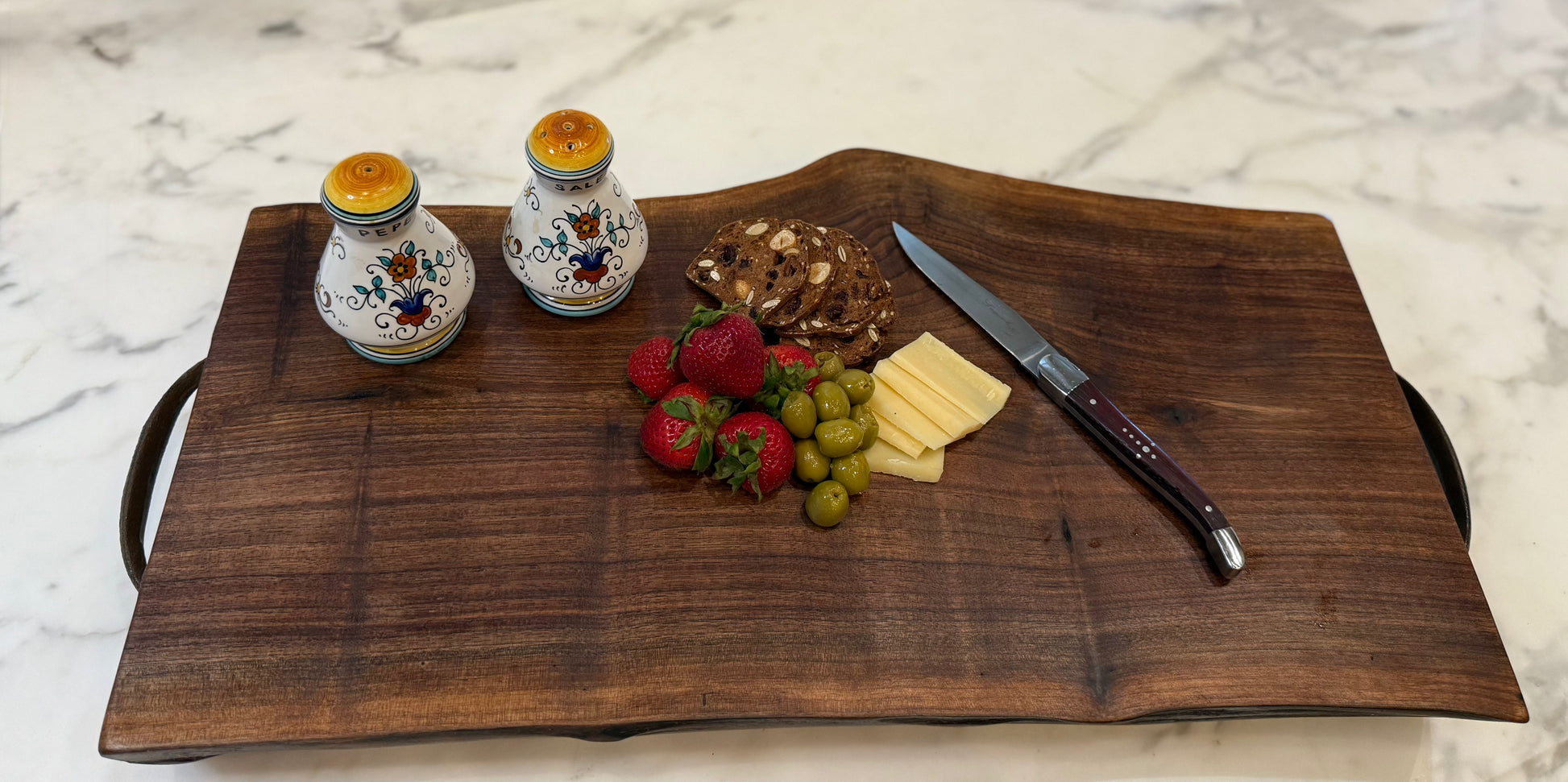 Elevate your hosting game with our handmade black walnut charcuterie board — a perfect centerpiece for cheese spreads, appetizers, and special gatherings. Crafted from premium, sustainably sourced wood, each board is a functional work of art. This board features rich, swirling grain patterns and natural color variations that make each piece truly one of a kind. Designed for both function and presentation, it includes elegant handles for easy carrying and a touch of rustic elegance.